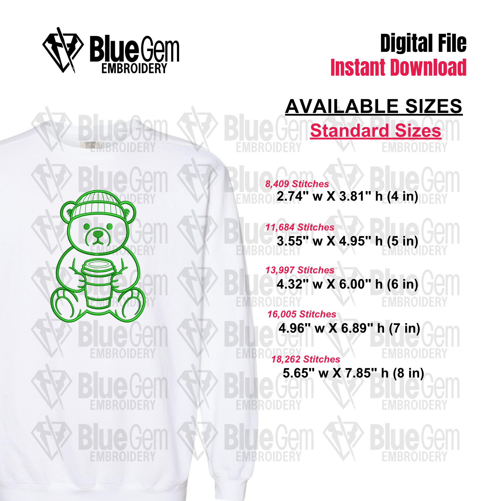 Hot Coffee Teddy Bear Applique Embroidery Design: 5 Sizes Included (Instant Download)