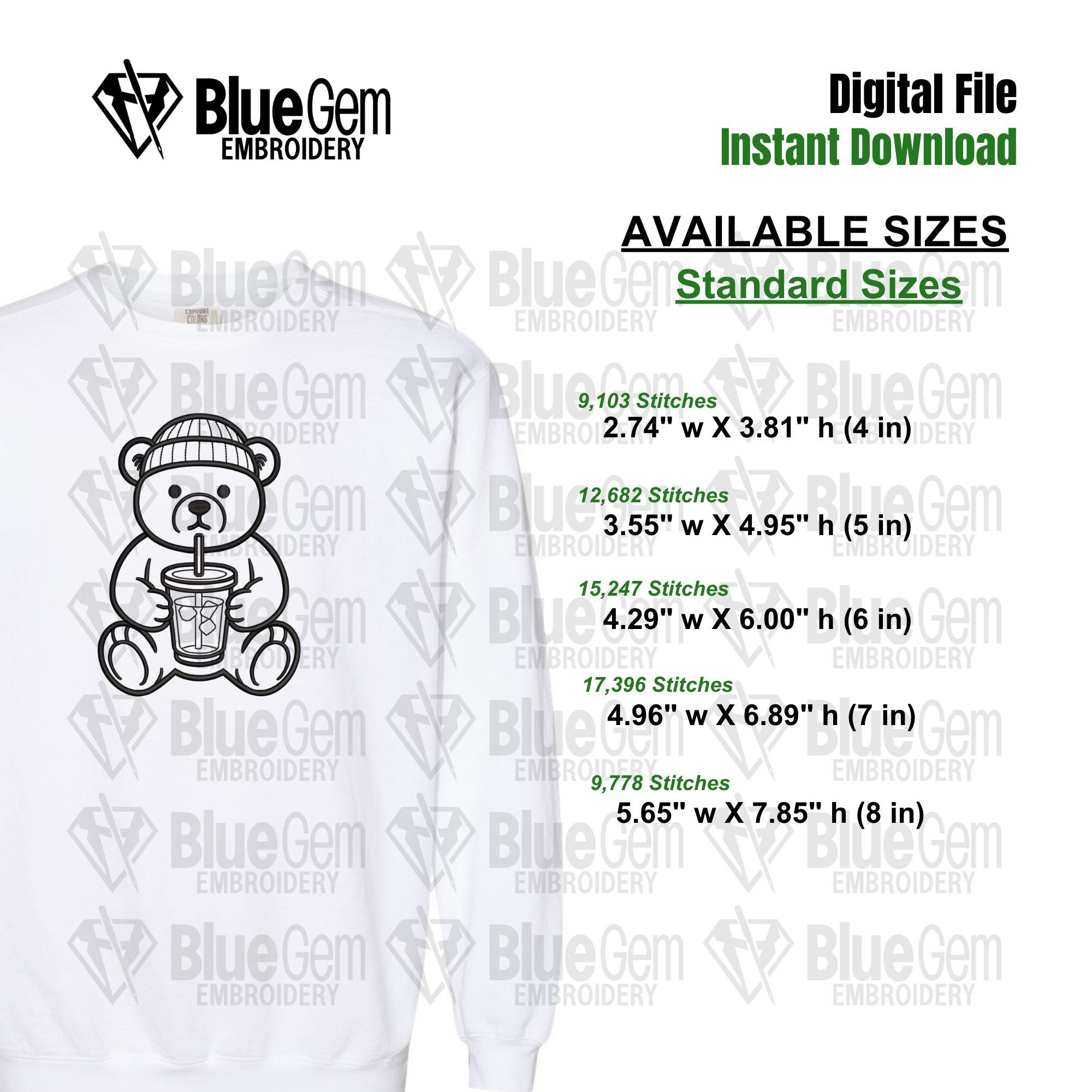Iced Coffee Teddy Bear Applique Embroidery Design: 5 Sizes Included (Instant Download)