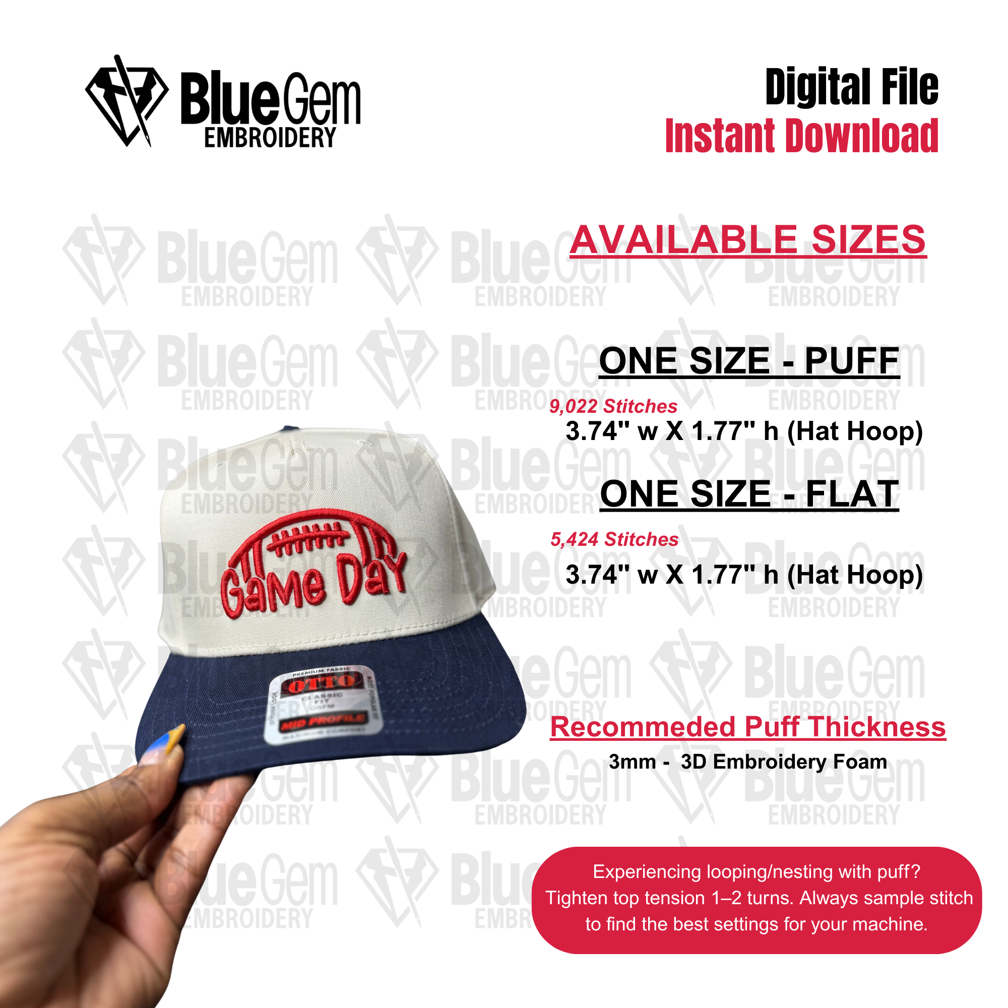 Game Day 3D Puff Hat Embroidery Design - Football Hat Embroidery Design- Football Season - 1 Size - 3D Puff and Flat - Instant Download
